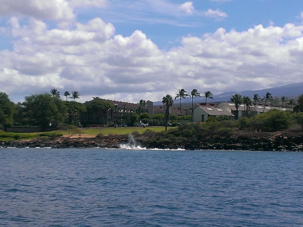 Apnée à l'île Molokini. Au retour nous avons arrêté à un endroit privilégié des tortues de mer où elles se cachent pour se faire laver par des petits poissons . Le spectacle est superbe. La photo montre la page en face de notre condo où cet endroit à tortues se situe.