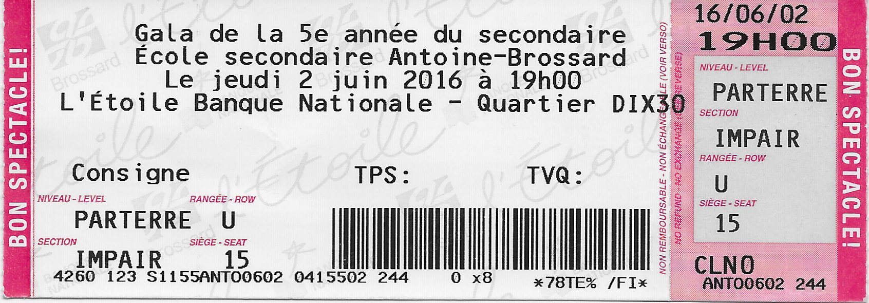 Billet entrée Gala Danick Antoine-Brossard 2 juin 2016